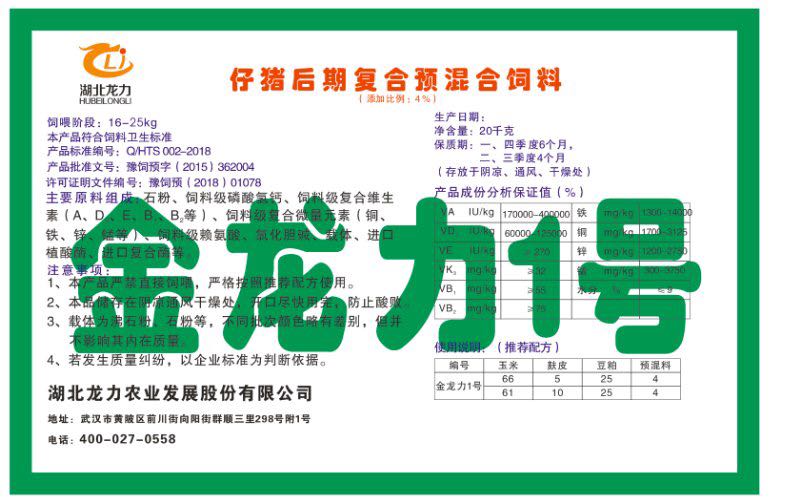 湖北龍力農業發展股份有限公司坐落于武漢市黃陂區前川街向陽街群順三里298號附1號。公司成立于2014年6月,公司自成立以來把“創全球最大養豬綜合服務”為企業愿景。致力于打造教保料品牌”作為公司發展的明確目標。公司一直致力于豬營養的研究和開發,積極與國內外高校和科研機構合作,推廣養豬技術、動物營養新概念,向世界農牧企業學習與合作。公司采用國內先進的生產工藝,選擇高精度電子配料秤,高均勻度、無殘留混合機等先進設備....